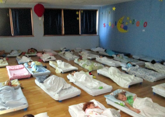 Dopo pranzo i bambini di tre anni che ne hanno bisogno riposano nell’aula della nanna.